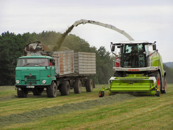 Abbildung: Feldhäcksler bei der Arbeit (Quelle: HTW Dresden, Prof. Dr. agr. Wild)